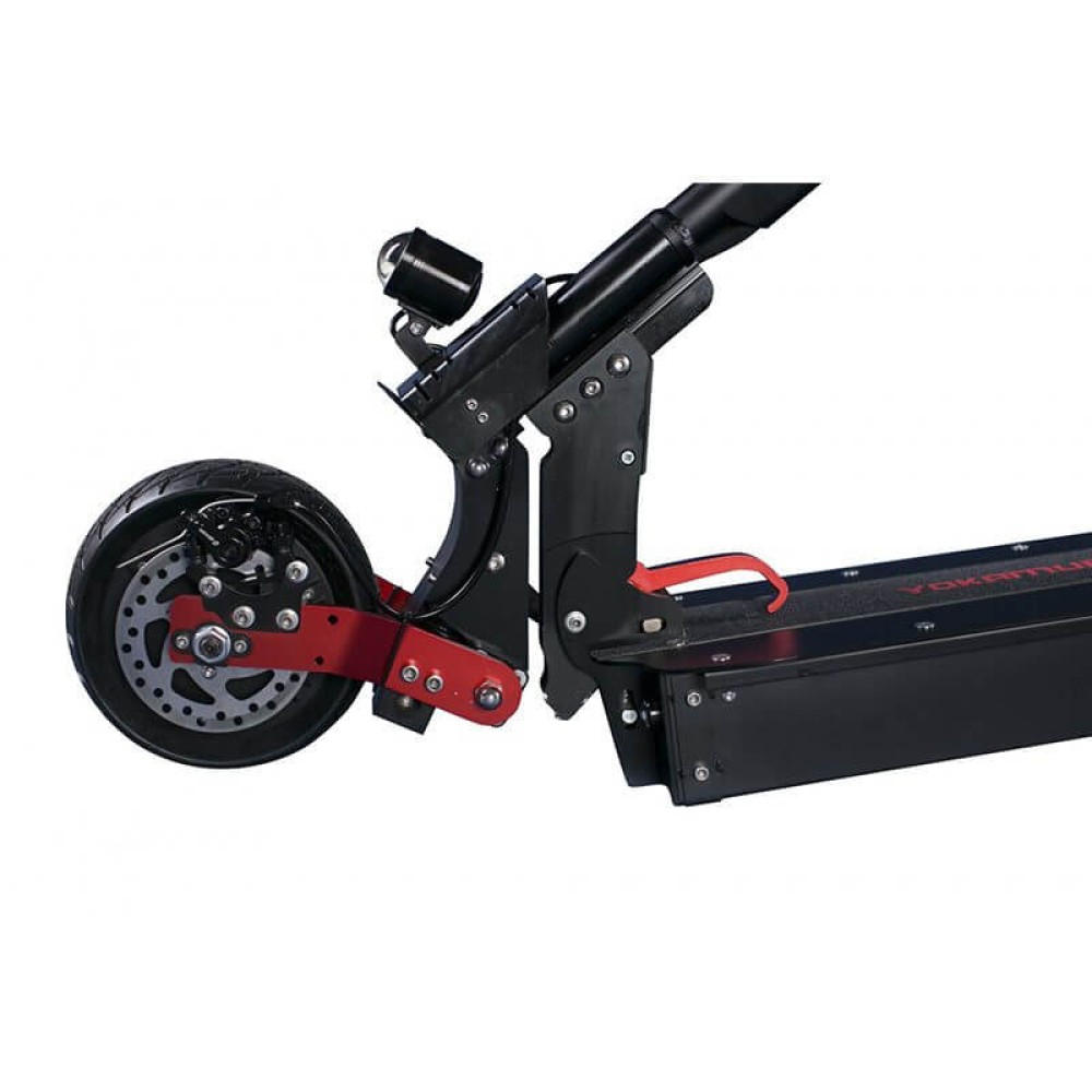 Для передвижения на дальние расстояния в комплекте идет широкое удобно сидение. Электросамокат Yokamura G полностью складывается что позволяет его удобно хранить и транспортировать. На руле с правой стороны расположен замок зажигания с Вольт-метром для более точно отображения заряда, там же кнопки включения и отключения полного привода и эконом режима. Так же самокат оборудован специальной подножкой для удобства парковки.